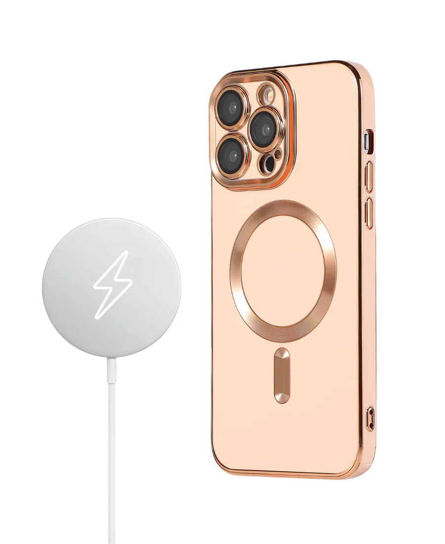 Introducing the protective Luxe MagSafe phone case complete with rose gold detailing and a glossy finish. Built-in lens protector keeps your camera lens safe from bumps and scratches.
