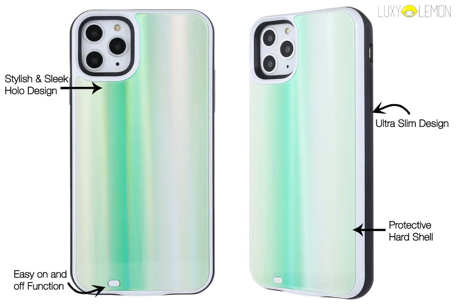 Charge your device on the go with this built in external battery pack phone case featuring a sleek holo design. Provides a charge of 60-100% extra battery life to your device depending on your phone model.