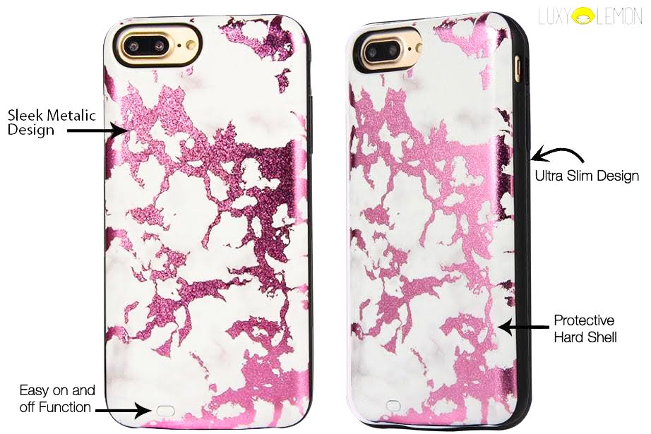 Charge your device on the go with this built in external battery pack phone case! Our lightest and slimmest case to date featuring a sleek marble metallic design. Provides a charge of 60-100% extra battery life to your device depending on your phone model.