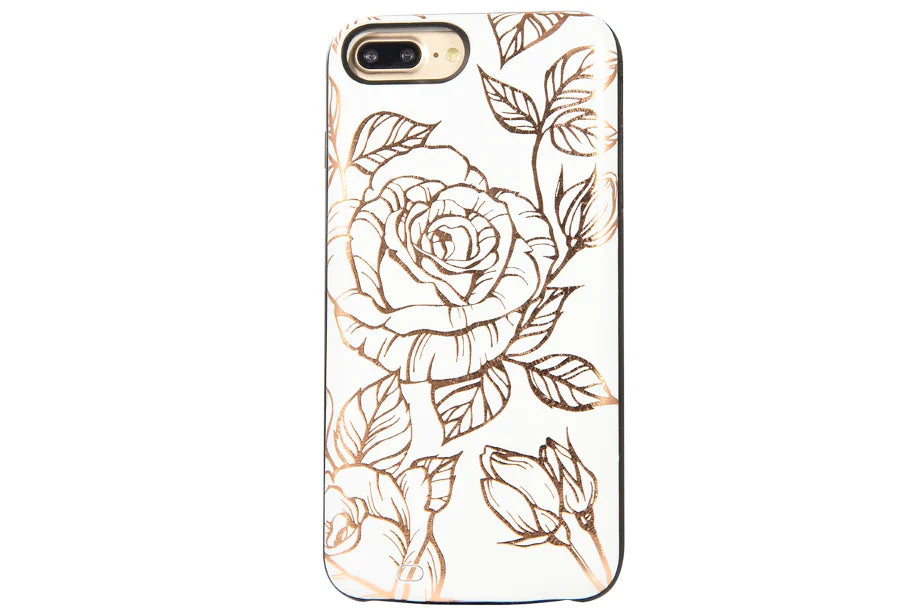 Charge your device on the go with this built in external battery pack phone case! Our lightest and slimmest case to date featuring a pretty metallic floral design. Provides a charge of 60-100% extra battery life to your device depending on your phone model.